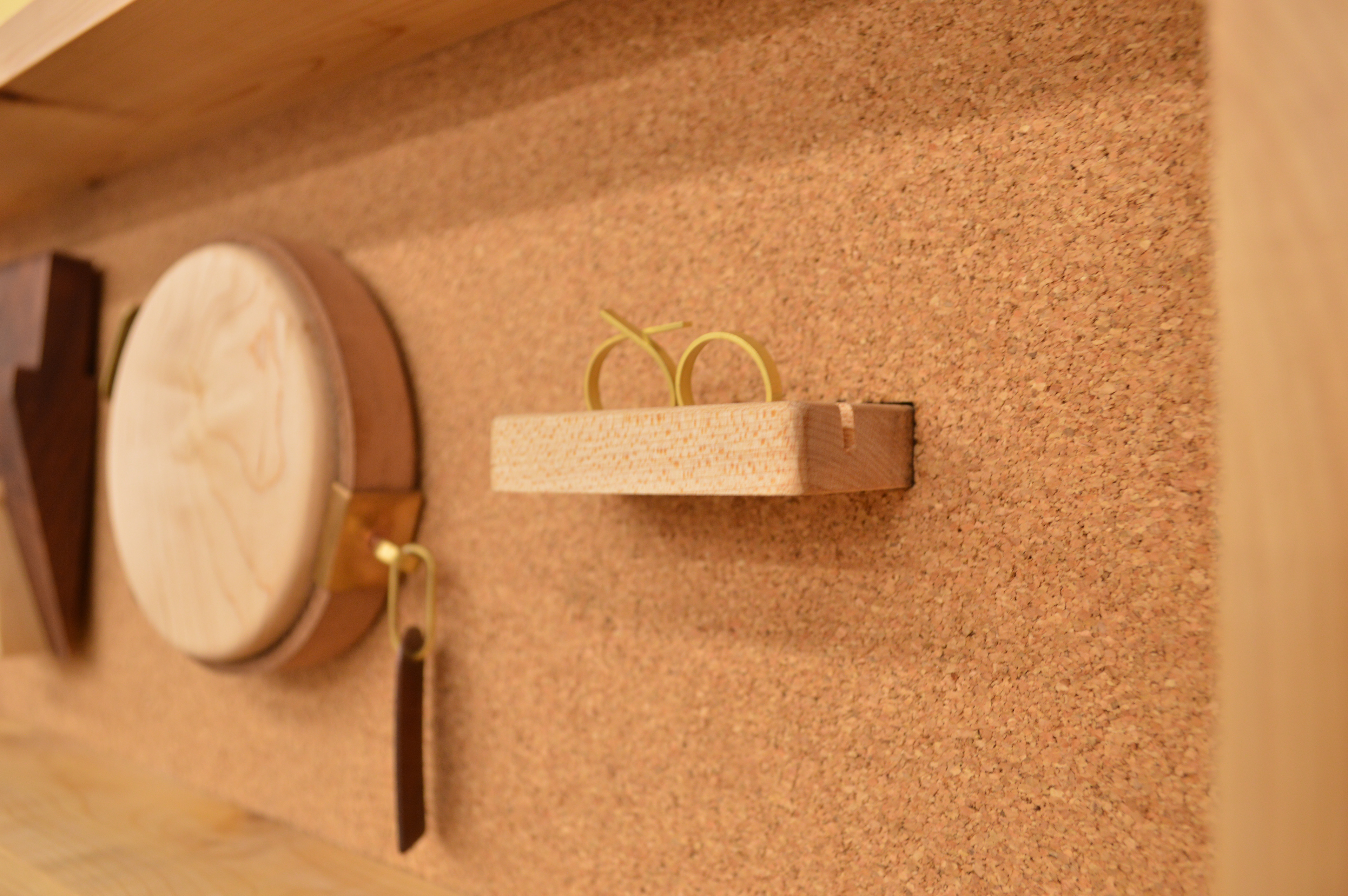 Cedar, gold, cork, brass, bronze, enamel on copper, maple, mahogany, leather.