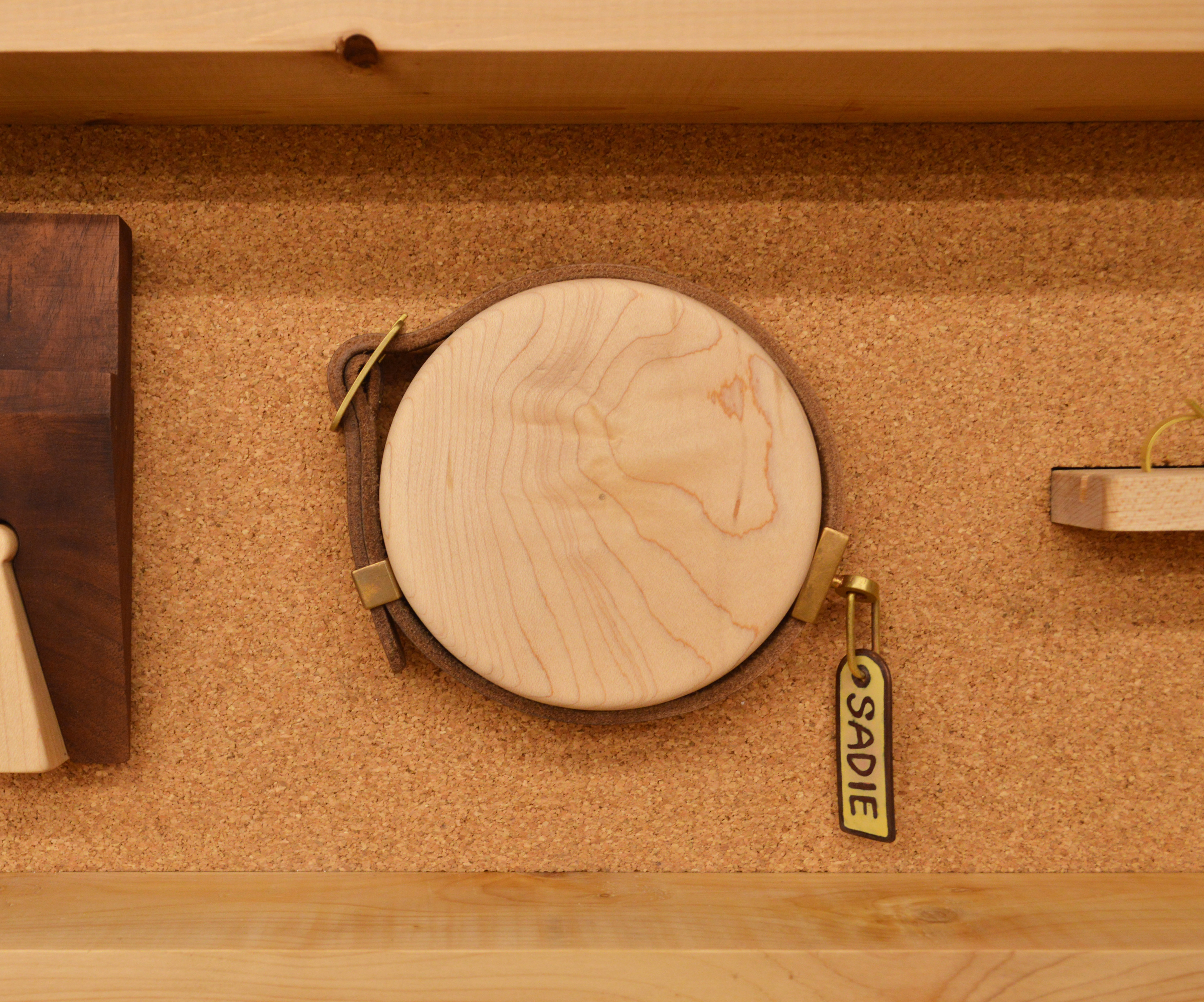 An empty brass keyring. A new mahogany jeweler's bench pin.