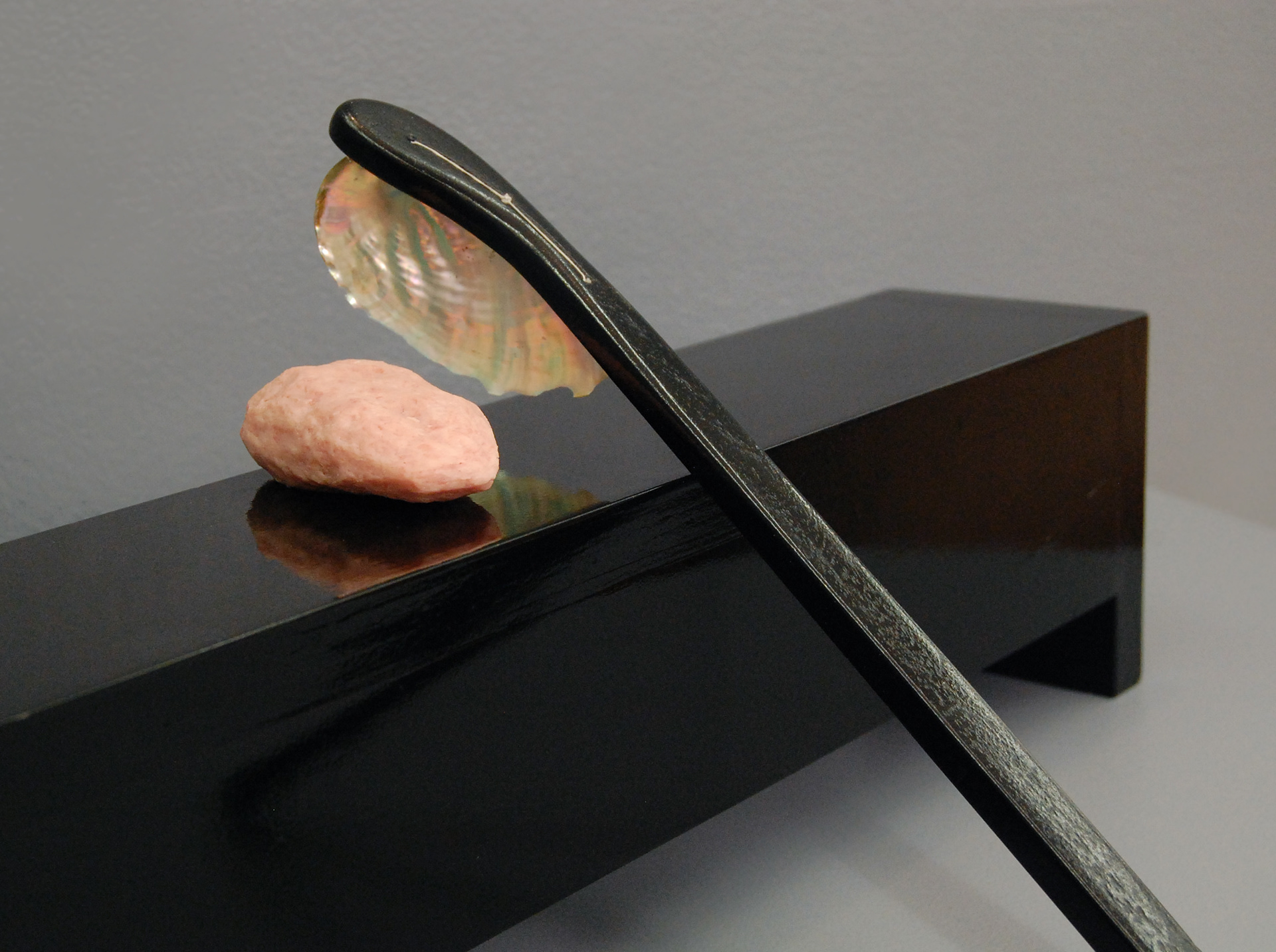 I asked my mother to make a traditional Korean abalone porridge and send me the discarded shells. The abalone shell was ground down to expose the mother-of-pearl then strung to a handle to create the cutting implement. The platform is lacquered plywood sprayed with industrial bike paint to mimic the aesthetics of Korean black lacquerware boxes and furniture.
